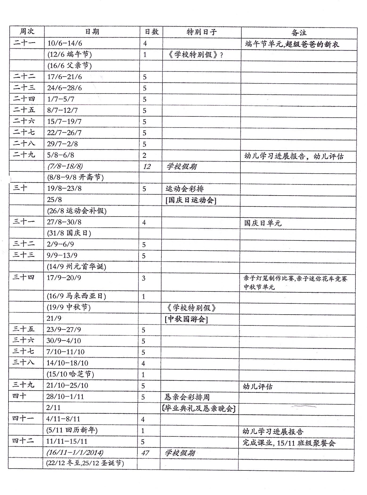 上课周次及假期表